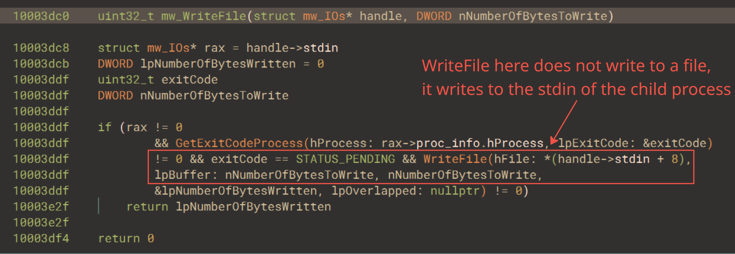 The WriteFile here seems to have confused a few analysts as a few reports mentioned this as a capability to "download and execute a file" while it's actually not writing anything to a file. It's simply leveraging WriteFile as a way to "type" into cmd.exe.