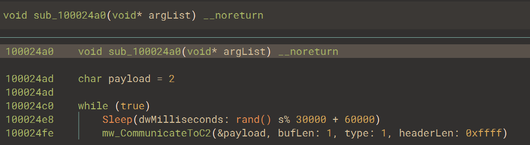 From there, we observe that the sample sleeps for a randomized duration and initiates communication with the C2 using a sessionId of 0xFFFF (we'll revisit this detail later).