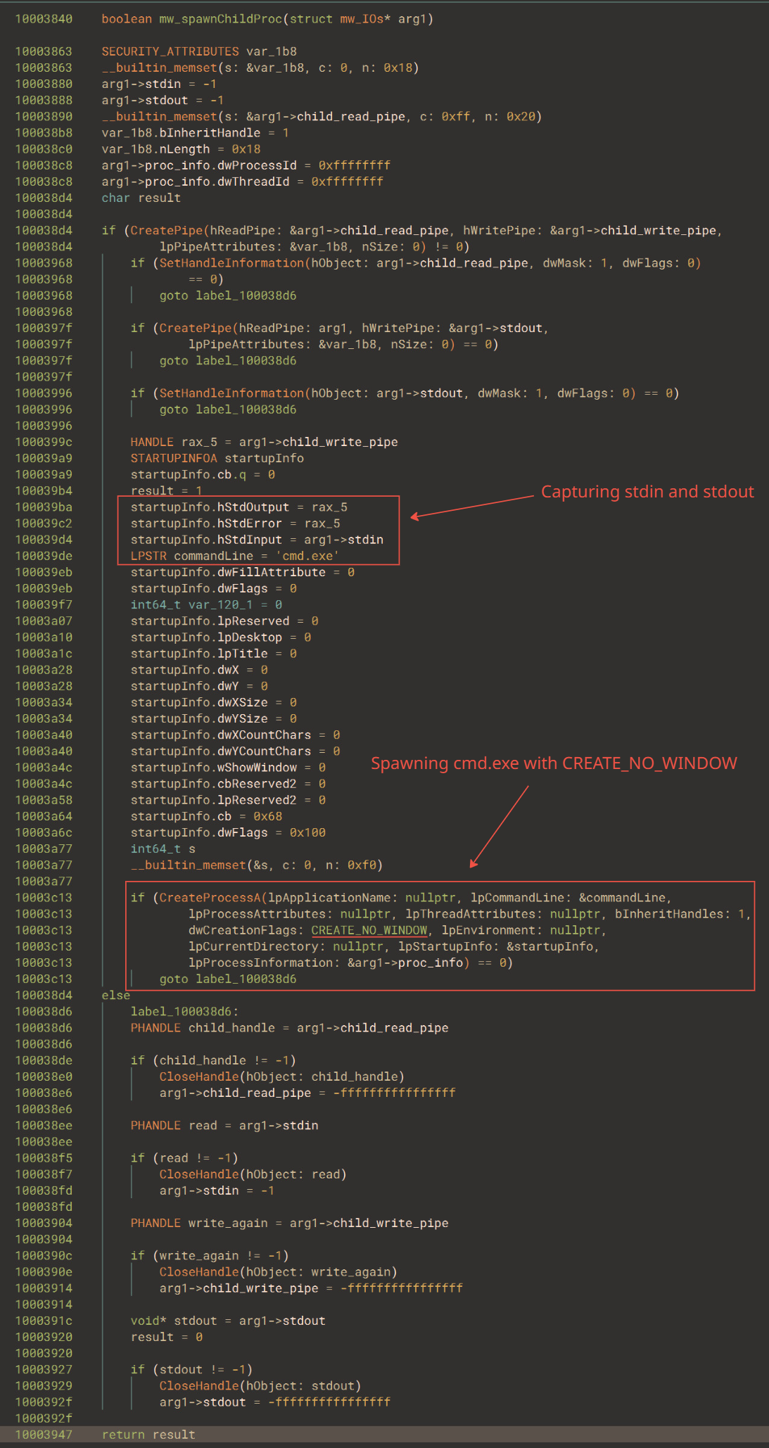 Before running any command, it'll start creating a new session and creating a child process running cmd.exe while saving it's stdin and stdout handles to a custom structure (this is important for the next steps). We can also note that the child process is create with the CREATE_NO_WINDOW (0x08000000) dwCreationFlag which makes sure that no window pops up.