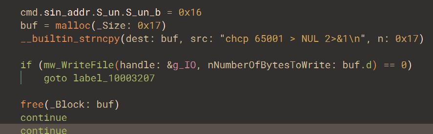 It then continues by setting the reverse shell code page to 65001 (UTF-8) and starts writing the command directly to the IO of the child process through mw_WriteFile